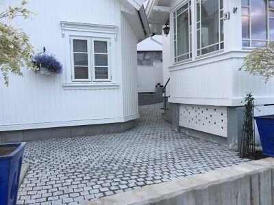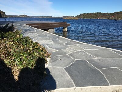 Vi utførerer og vi legger alt i skife, gjerne på støpt såle og med fast fug mellom skiferhellene eller på løst underlag hvor gress kan fungere som fug.